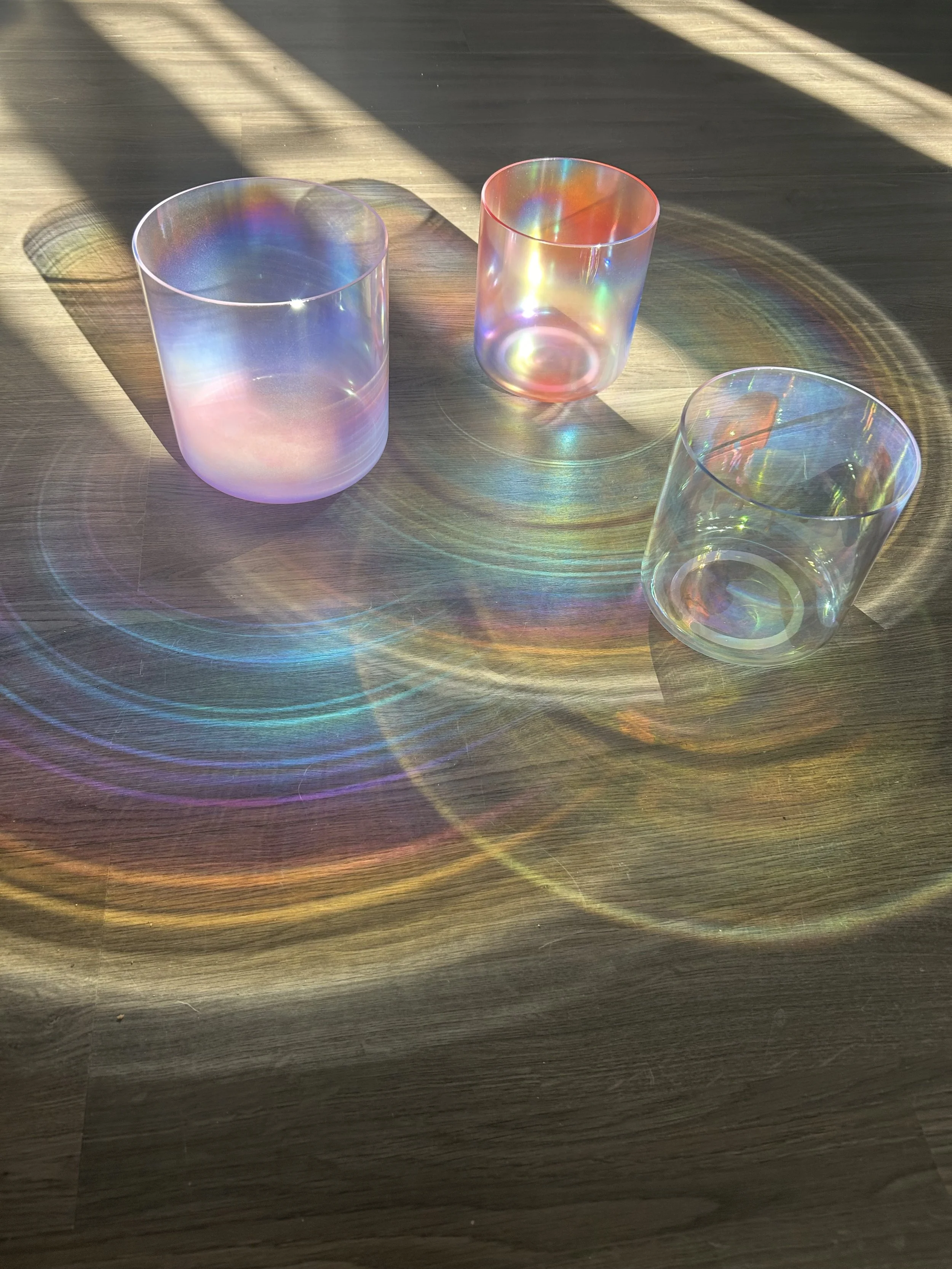 Each Rainbow Tones Crystal Bowl is handcrafted from 99.9% pure quartz crystal, chosen for clarity, sustain, and luminous resonance. Their tones ripple with intention, guiding meditation, sound journeys, yoga, personal practices, and more.